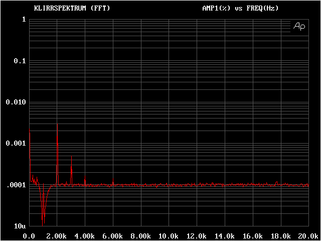 an 4 Ohm Last: 0,0039 %, an 8 Ohm Last: 0,0055% (Angaben bei 1 kHz und 10 Watt,